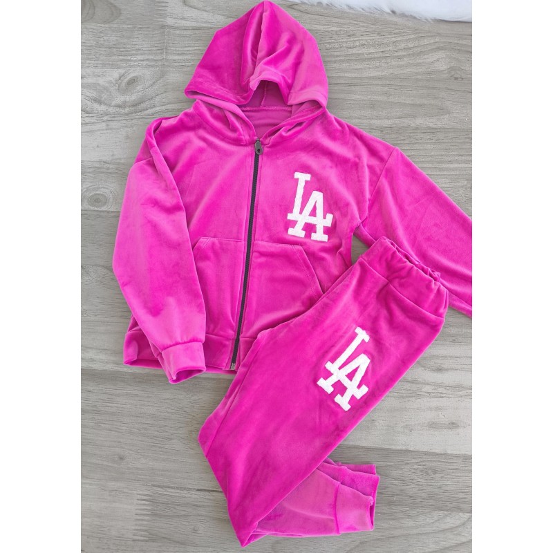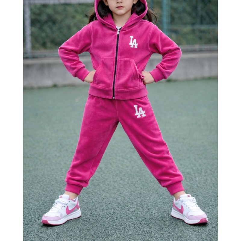 Dres welurowy w kolorze cukierkowy róż, składający się z bluzy z kapturem zapinanej na zamek oraz spodni na elastycznej gumce.